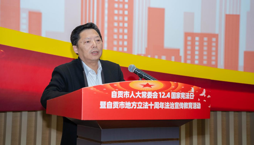 自贡市人大法制委主任委员蒋宗涛介绍了活动整体安排。我校法学院法学专业学生王崇欢作为青年代表发言。