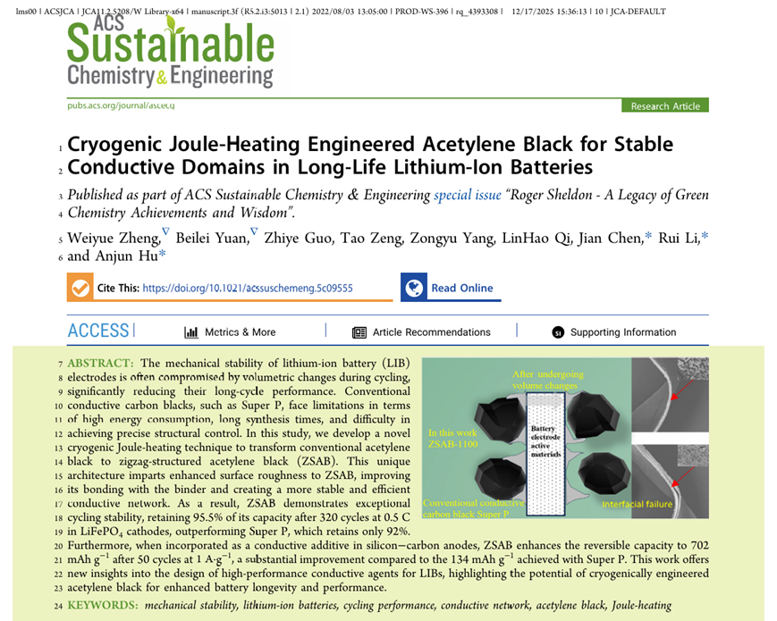 近日,材料学院陈建教授团队研究生在锂离子电池关键材料研究方面取得突破,相关研究成果以《Cryogenic Joule-Heating Engineered Acetylene Black for Stable Conductive Domains in Long-Life Lithium-Ion Batteries》为题发表于国际顶刊《ACS Sustainable Chemistry & Engineering》(IF:7.3 中科院1区Top)。该研究针对电池循环过程中导电网络易因电极材料膨胀收缩而失效的关键问题,从材料结构与界面相互作用入手,提出了创新解决方案。