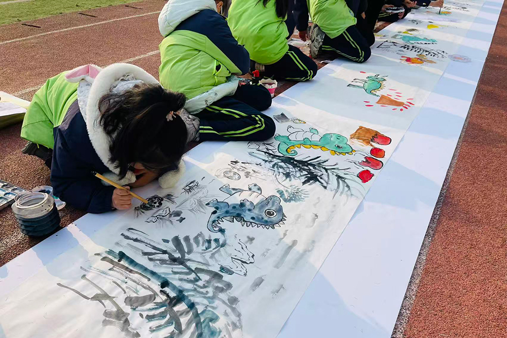 在自贡市汇南实验学校、沿滩第二小学校等八所学校的操场上,活动同步开展。操场变身“露天画室”,千余名中小学生手执画笔,在铺设的近百米长卷上尽情创作,共绘心中的“恐龙王国”。画作风格多样,既有科学严谨的骨骼复原图,也有充满现代感的抽象表达。