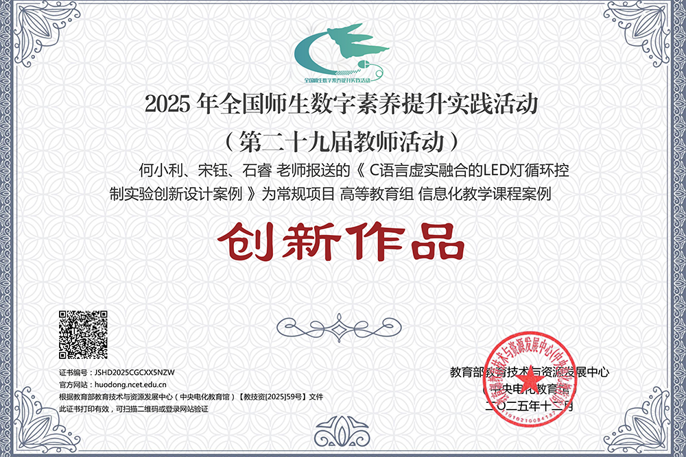 近日,2025年全国师生数字素养提升实践活动(第二十九届教师活动)获奖结果公布。计算机科学与工程学院何小利团队报送的信息化教学课程案例《C语言虚实融合的LED灯循环控制实验创新设计案例》,经四川省教育厅推荐,在全国评选中脱颖而出,荣获常规项目高等教育组“创新作品”荣誉。
