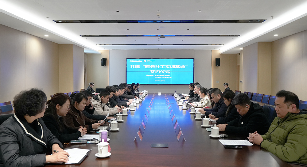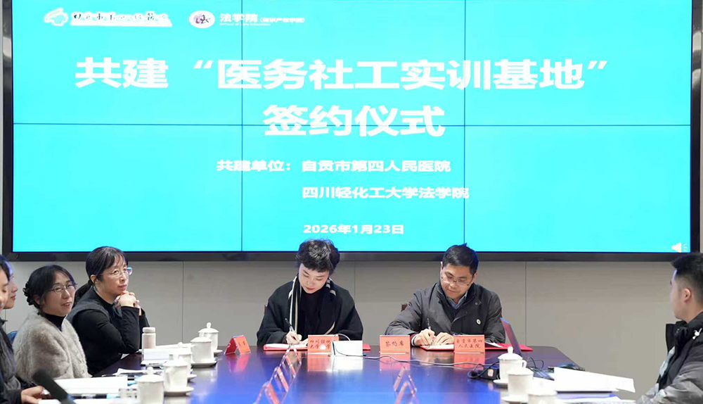 1月23日,我校法学院与自贡市第四人民医院在四医院南湖总院举行签约仪式。市卫生健康委、教育部门、团市委及相关单位代表出席活动。此次合作旨在推动医务社工专业教育与临床实务深度融合,为地区培养复合型人才。