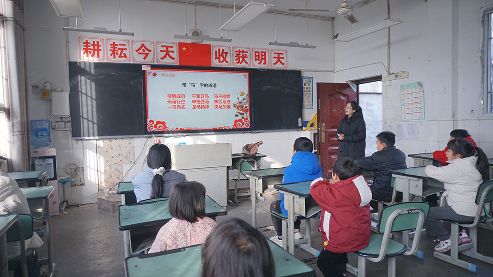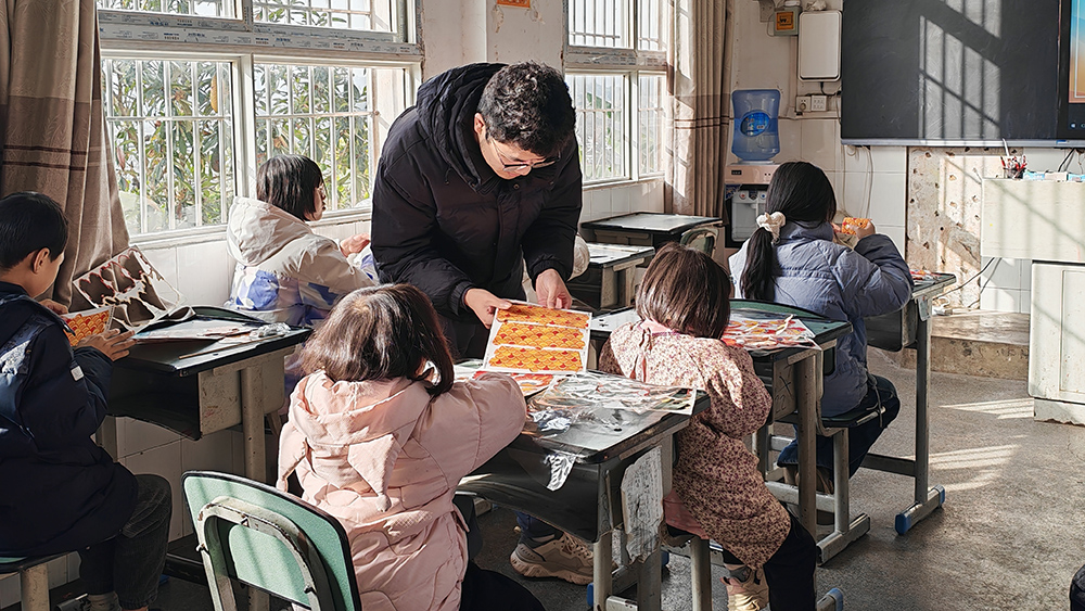 漆树社区党群服务中心前,梁川带领送文化小分队4位成员现场书写春联和福字,向社区群众带去新春的祝福。在社区工作人员的协助下,现场书写活动有序开展,前来领取春联和福字的群众络绎不绝,师生送出春联和福字110余张。紧邻一侧的漆树中心小学教室内,4位成员组织15名小学生练习普通话发音技巧,诵读关于“灯”的诗歌,并指导小学生亲手组装彩灯。