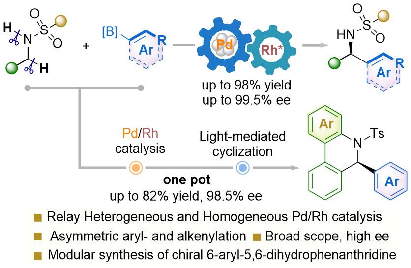 该论文发展了一种新颖的非均相相钯与均相铑接力催化体系,首次实现了N-磺酰基胺的直接不对称α-C–H键芳基化与烯基化反应。该策略的核心在于:非均相钯催化剂(如Pd(OAc)₂)在溴苯作为温和氢受体的作用下,实现N-磺酰基胺的去饱和化反应,原位生成N-磺酰亚胺中间体;随后,手性铑催化剂(如[Rh(L2)Cl]₂)对该中间体进行高对映选择性的芳基或烯基加成,最终获得手性α-支链胺。该方法克服了传统方法对环状胺的限制,成功应用于多种直链、苄位及位阻较大的胺类底物,产物收率高达98%,对映选择性最高可达99.5% ee。此外,该策略还被扩展至手性6-芳基-5,6-二氢菲啶类化合物的合成。机理研究表明,钯催化的去饱和化步骤为非均相催化过程,而均相铑催化的加成步骤速率远快于背景反应,是高对映选择性的关键。该研究为惰性C–H键的直接不对称官能化提供了新思路。