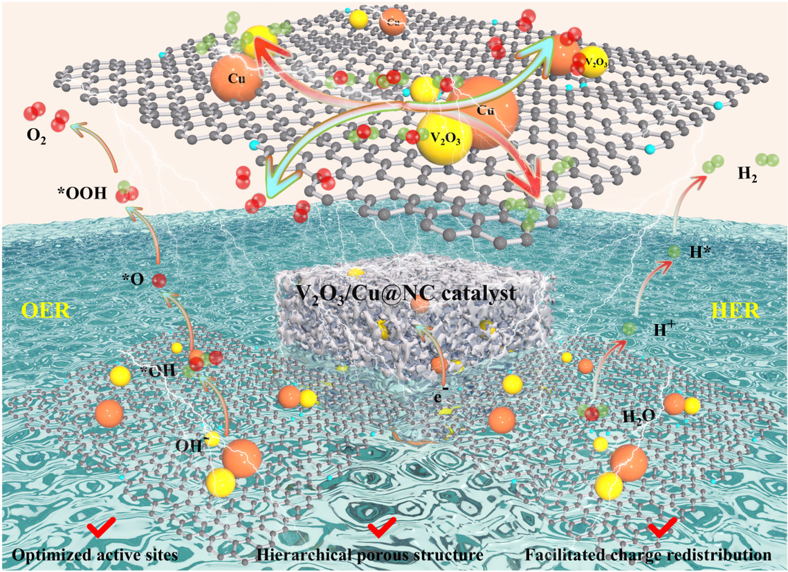 开发成本低廉且效率高的双功能催化剂对电解水技术的大规模推广至关重要。该研究工作通过溶胶-凝胶结合热解策略,构建了一种新型氮掺杂碳负载V2O3掺杂铜纳米颗粒催化剂(V2O3/Cu@NC),用于析氧反应(OER)和析氢反应(HER)。研究发现,钒掺杂可引入丰富的氧空位,提高吡啶氮含量,并通过铜-钒之间的电荷重新分配调控电子结构,从而增强电荷与质量传递的效率。优化后的V2O3/Cu@NC-1.0材料在1 M KOH溶液中,在10 mA cm-2电流密度下,HER和OER的过电位分别为50 mV和313 mV。在双电极电解槽中,以V2O3/Cu@NC-1.0同时作为阴极和阳极构建的电解池仅需1.65 V即可达到10 mA cm-2,并在50 mA cm-2下表现出超过100小时的稳定性。该研究为设计高性能电解水催化剂提供了一种可持续的策略。